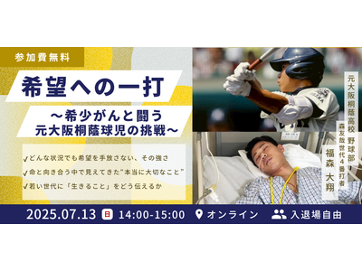 「希望への一打 ~希少がんと闘う元大阪桐蔭球児の挑戦~」を無料で開催いたします。