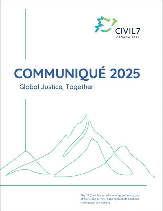 - G7の公式エンゲージメントグループのひとつである 「Civil7(以下、C7)」は、カナダのネットワークNGOである「コーポレーション・カナダ(Cooperation Canada)」のリーダーシップのもと、運営委員会と分野別ワーキンググループが設置さ れ、「C7政策提言書(C7 Communique)」の作成をはじめとする政策提言を行っています。