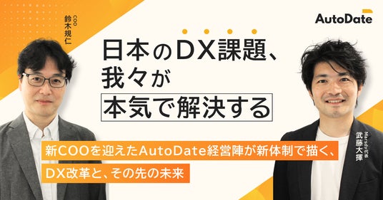 COO就任にあたり、代表 武藤とCOO 鈴木が、「これからの日本に必要なDX改革とはなんなのか」、そして「AutoDateはそこにどう関わっていきたいか」というテーマで、2人で語り合い、対談記事を公開しております。ぜひご覧ください。