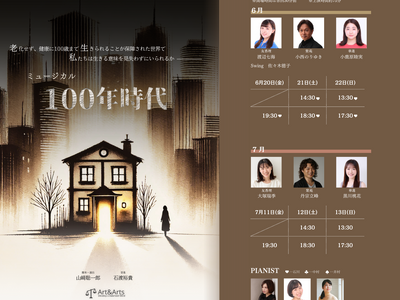 合同会社Art&Artsは、80万部超のベストセラー『こども六法』の著者である山崎聡一郎脚本・演出による、新作ミュージカル『100年時代』を2025年6月20日(金)より音楽サロンScale(東京都板橋区)にて上演します。医療の進歩で「老化を止める」選択が当たり前になった世界を舞台に、「幸せな長寿に向けた人生選択とは?」という現代的な問いを、わずか20数席の濃密な空間で観客に投げかけます。本年2月のメイキング公演を経て、観客と共に創り上げてきた本作が、新キャストを迎え遂に本公演の幕を開けます。