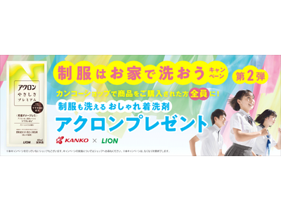 菅公学生服株式会社 (本社:岡山市北区駅元町、代表取締役社長:尾崎 茂 以下:カンコー学生服)は、 ライオン株式会社(本社:東京都台東区蔵前、代表取締役兼社長執行役員:竹森 征之 以下:ライオン)と連携して、制服の家庭洗濯の不安解消を目的とした「制服はお家で洗おうキャンペーン」の第2弾を2025年6月より実施いたします。このキャンペーンでは、カンコーショップで商品を購入される方に、ライオンの「アクロンやさしさプレミアム」や「洗濯魔法BOOK」を約2万名に無料でプレゼントいたします。