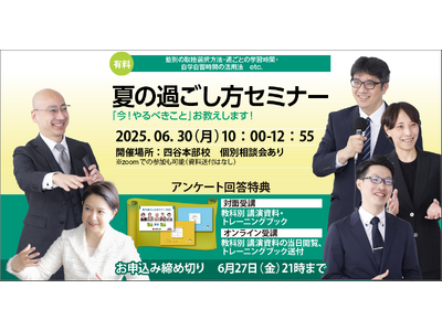 株式会社日本教育指導総合研究所JET(所在地:東京都新宿区、代表取締役:屋口 京子)が運営する中学受験専門の個別指導塾・家庭教師派遣の受験Dr.は、中学受験生の6年生保護者対象の「夏の過ごし方セミナー」を、2025年6月30日(月)に開催する。