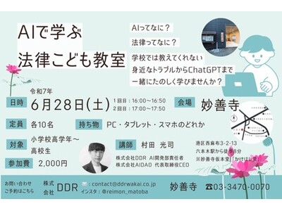 株式会社DDR(本社:東京都港区虎ノ門、代表取締役社長兼執行役員CEO的場令紋)は、2025年6月28日(土)に、小中高生を対象とした教育イベント『AIで学ぶ法律こども教室』を開催いたします。