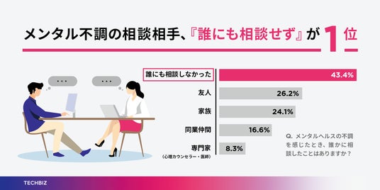 注目すべきは、『メンタルヘルスの不調を感じたとき、誰かに相談したことはありますか?』という質問に対して、『誰にも相談しなかった』人が43.4%で1位となり、2位の『友人』(26.2%)を大きく引き離す顕著な結果となった点です。