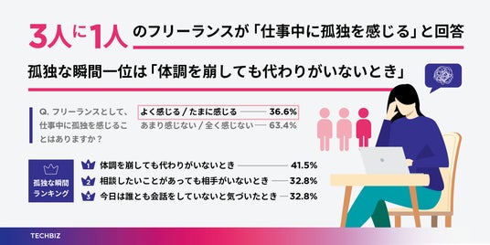 フリーランスの3人に1人以上が「仕事中に孤独を感じる」と回答。孤独を感じる瞬間としては、「体調を崩しても代わりがいないとき」(41.5%)、「相談したいことがあっても相手がいないとき」(32.8%)、「今日は誰とも会話していないと気づいたとき」(32.8%)といった、“つながりのなさ”が強調されました。