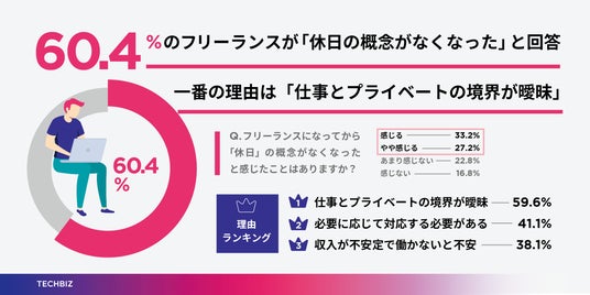 夏本番が近づくなかでも、フリーランスにとって「休み」は簡単に得られるものではありません。「フリーランスになってから休日の概念がなくなった」と回答した人は60.4%。理由として「仕事とプライベートの境界が曖昧」(59.6%)が挙げられました。「収入が不安定で働かないと不安」(38.1%)という声も多く、休みそのものよりも、“休むことによる収入減”への不安を感じている人もいます。