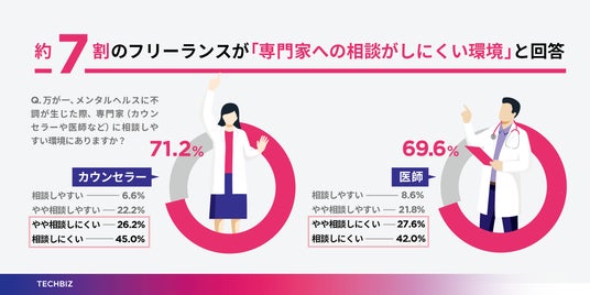 また、メンタルヘルスに不調が生じた際に、カウンセラーに相談しにくいと感じる人が71.2%、医師に相談しにくいと感じる人も69.6%に上る点も重要な課題です。約7割のフリーランスが専門的な支援を受けにくい状況にあり、メンタル悪化のスパイラルを加速させている実態が明らかになりました。