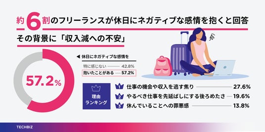 実際に、休日にネガティブな感情を抱く人は57.2%。「仕事の機会や収入を逃す焦り」(27.6%)を感じている人も少なくありません。