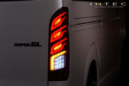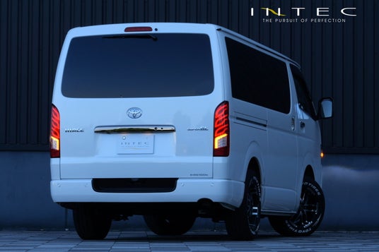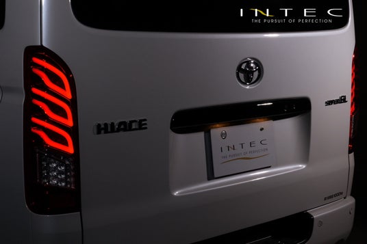 INTECの「200系ハイエース用フルLEDテールランプType2」は、ポジションONで縦に配置された3連のファイアーパターンが美しく浮かび上がる。圧倒的な存在感は、見る者に強烈な印象を残します。その魅せるデザインは、それぞれの形状が異なる細くシャープに光るライトバーにあります。このこだわりのライトバーの形状により、両立の難しい繊細さと力強さを演出します。