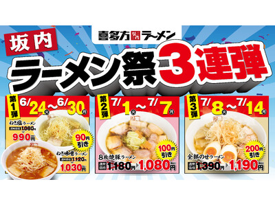 「喜多方ラーメン坂内」をはじめ国内外で多様なジャンルの飲食店事業を手掛ける株式会社麺食(本社:東京都品川区、代表取締役社長:中原 誠) は、「喜多方ラーメン坂内」全店にて、『坂内ラーメン祭り3連弾』を2025年6月24日(火)~7月14日(月)の3週間、開催いたします。味噌ラーメン・塩ラーメンや新しいメニューをお得な価格でお楽しみいただけるキャンペーンとなっております。
