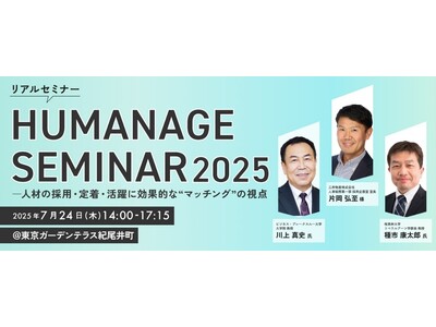 人材の“採用”から“定着”、その先の“活躍”までを支援する人材サービス事業を展開する株式会社ヒューマネージ(本社:東京都千代田区、代表取締役社長:齋藤 亮三)は、2025年7月24日(木)、東京ガーデンテラス紀尾井町 紀尾井カンファレンスにおいて、人事・採用ご担当者様向けセミナー『HUMANAGE SEMINAR 2025―人材の採用・定着・活躍に効果的な“マッチング”の視点』を開催いたします。