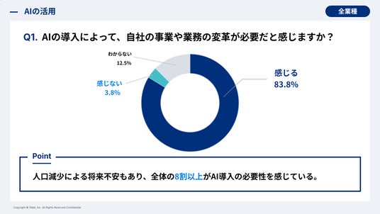 業務へのAI活用の必要性は高まっている「AI導入によって業務変革が必要」と答えた企業は全体の83.8%。製造業でも同様の傾向が見られました。