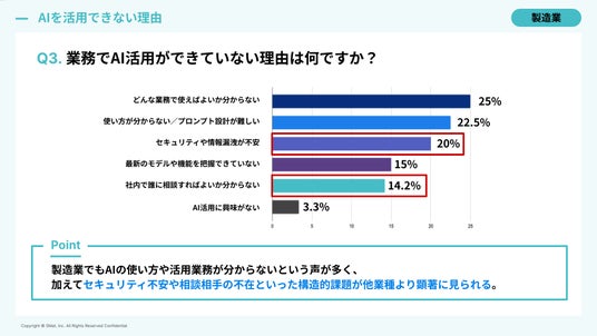 製造業では特有のハードルも浮き彫りに製造業においては、他業種と同様に業務適用のイメージ不足やスキルの問題が挙がった一方で、