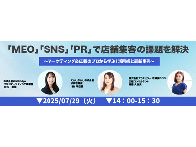 店舗集客の手法が多様化する中、「どの施策を選べばよいかわからない」「集客しても思うような成果が出ない」といった課題を抱えていませんか? 本セミナーでは、株式会社WeBridge、むかしむかし株式会社、株式会社プラスカラーの3社が共催し、各分野の専門家が店舗集客を加速させるための「MEO」「SNS」「PR」活用術や、最新トレンド、実店舗運営に役立つ具体的な施策まで事例を交えて分かりやすくご紹介します。