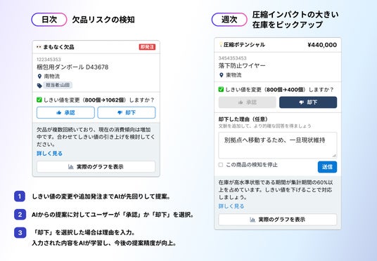 さらに、本機能は、製造現場の誰もが直感的にAIを活用できる点を特長としています。複雑な操作や専門知識は一切不要で、普段お使いの画面上でAIからの提案を確認・判断するだけで在庫最適化が実現します。高度な分析や問題の抽出はAIが担い、現場担当者は実物確認と意思決定に集中できるため、業務効率の大幅な向上に貢献します。
