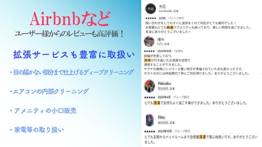 事業内容:民泊・宿泊施設専門の清掃代行、運営支援