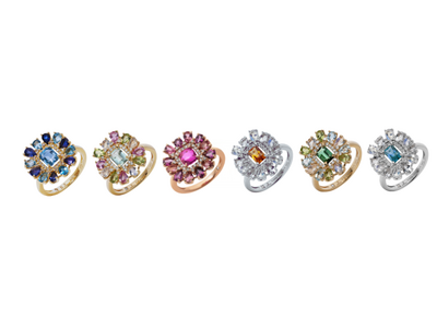 花が咲き誇る瞬間を切り取った、立体的なデザインが特徴のアイコニックコレクション『Blooming』。花びら一枚一枚に高低差をつけることで、光を受けたときにまばゆい煌めきを放ちます。中央にはブランドのシンボルであるスクエアカットのカラーストーン。周囲をダイヤモンドが繊細に取り囲みます。まるで指先で花が開き、喜びが広がるような、心まで華やぐリングです。新たに4色が加わり、全6色がラインアップ。