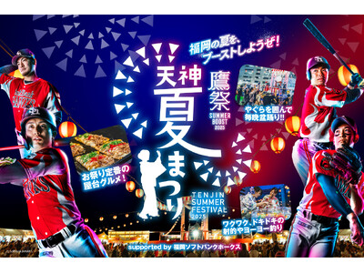 天神まちづくり共同事業体(主催:天神夏まつり2025実行委員会(詳細は下記)、事務局:株式会社サエキジャパン/本社・福岡市中央区清川、代表取締役社長・佐伯岳大)は、7月17日(木)~8月17日(日)に福岡市役所西側ふれあい広場で開催される「鷹祭 SUMMER BOOST meets 天神夏まつり 2025」を福岡ソフトバンクホークス株式会社(本社:福岡県福岡市 代表取締役社長CEO:後藤芳光)と今年もタッグを組み一緒に福岡の夏を盛り上げていくこととなりましたので、お知らせします。