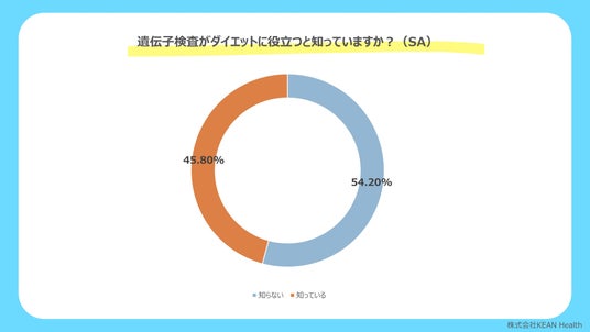 遺伝子検査がダイエットに役立つと知っている人が54.2%存在し、ダイエットにおける遺伝子検査への関心が高まっていることが明らかになりました。