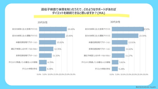 ゲノムや遺伝子を一般消費者へ広めるためにサービスを展開する株式会社KEAN Health(本社:東京都港区、代表取締役:山路 恵多)は、20代~30代女性(計1,000人)を対象に「ダイエットにおける遺伝子検査に関する意識調査」を実施し、より多くの方に遺伝子に基づいたダイエットのヒントを届けるべく、特設サイトを開設しました。