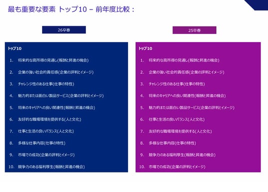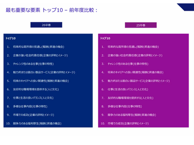 この分析では、優秀層の学生が職業選択において優先する魅力要素のトップ10を抽出・体系化し、現代の就職市場における価値観の変化を明確に示しています。