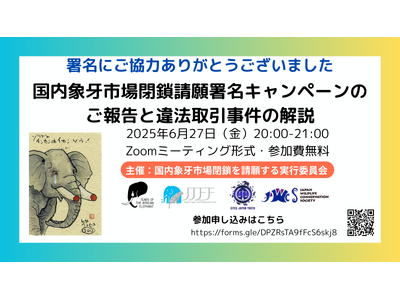 今回の署名キャンペーンに関する詳細報告と、請願内容の重要性を改めて知らしめることになった象牙違法取引事件の解説、および今後の活動について共有するオンライン報告会を開催いたします。