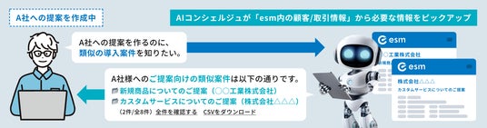 企業競争力向上のためのCRM/SFAを提供するソフトブレーン株式会社(本社:東京都中央区、代表取締役社長:豊田浩文、以下「ソフトブレーン」)は、自社プロダクトであるesm(eセールスマネージャー)の「esm AIコンシェルジュ ナレッジサジェスト」に、esm上のデータを対象に回答する新機能を提供開始します。