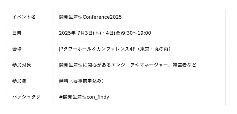 ソーシャルデータバンク株式会社(所在地:東京都港区、代表取締役:伊藤俊輝)は、2025年7月3日(木)・4日(金)に東京・丸の内で開催される「開発生産性Conference2025」にGoldスポンサーとして協賛いたします。