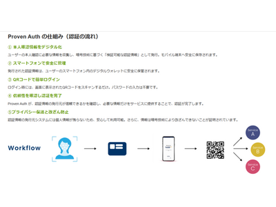 「Proven Auth」は、自己主権型ID(Self-Sovereign Identity:SSI)とシングルサインオン(SSO)技術を融合させた最新の分散型認証ソリューションです。ユーザーはユーザー名やパスワードを使う事なく、持ち運び可能なデジタルIDで瞬時に各種サイトにログイン出来ます。具体的には各サイト上のQRコードの読み取りを行うのみで、高度な暗号技術に基づいた「検証可能な認証情報」を使用する事が出来、安全かつ迅速にログインが可能となります。