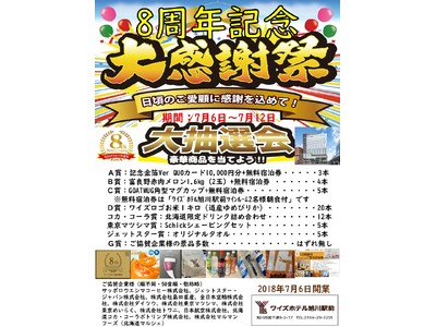 ワイズホテル旭川駅前は、2025年7月6日(日)~7月12日(土)の7日間限定で、8周年記念として限定金箔QUOカード(10,000円)や富良野メロン・無料宿泊券などが当たる大抽選会を開催します。