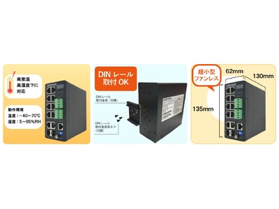 温度-40~70℃(結露なきこと)、湿度5~95%RHで動作が可能。DINレールを取付することができます(取付用金具付属)。寸法は62mm×135mm×130mmの超小型メタル筐体・ファンレス設計のため、取付場所を選ばない上メンテナンスが容易で、粉じん等が舞う過酷な環境下であっても平常通り稼働することができます。