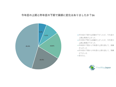 代表取締役の方に、今年度の上期と昨年度の下期で業績に変化はあったか聞いたところ、「変化なし」が45.4%、「昨年度の下期から今年度の上期を通して、業績が下がった」が20.9%、「昨年度の下期から今年度の上期を通して、業績が上がった」が18.6%、「昨年度の下期では業績が上がったが、今年度の上期は業績が下がった」が9.3%、「昨年度の下期では業績が下がったが、今年度の上期は業績が上がった」が5.8%という結果だった。