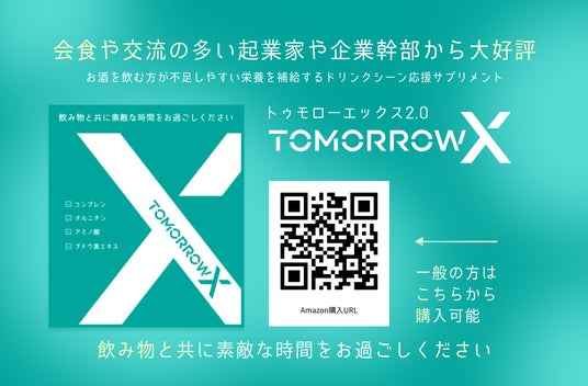 私たちが開発した「トゥモローエックス2.0」は、お酒を楽しむビジネスマンのためのサプリメントです。日々、事業の成長に情熱を注ぎ、日本の未来を切り拓く挑戦者の皆様が、翌日も最高のパフォーマンスを発揮できるよう応援したいという想いから、この度の協賛を決定いたしました。