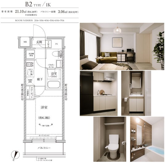 間取りは1K (21.10平方メートル )で構成しております。内装は優しい色合いの上質な白を基調とするシンプルモダンのインテリアで、都市型邸宅に相応しい寛ぎの住空間を演出します。手を触れることなく操作できる浄水器一体型タッチレス水栓や、広くて使いやすいボウル一体タイプの洗面ボウル、レバーひとつで手軽に温度調整可能なサーモスタッド機能付き混合水栓等デザイン性高い設備仕様にする事により、日々の暮らしをより快適にします。