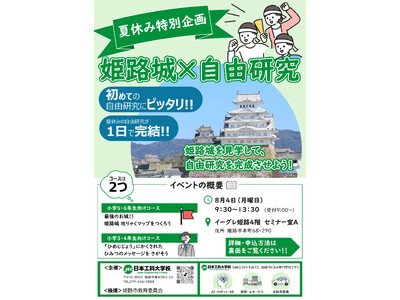 姫路城。学年に合わせて選べる2つのコースで姫路城を見学し、自由研究としてまとめます。はじめての自由研究に挑戦するお子さまでも安心!日本工科大学校の講師やスタッフが丁寧にサポートします。夏休みの思い出づくりにも最適な1日限りの特別イベントに、保護者の皆さまと一緒にぜひご参加ください。