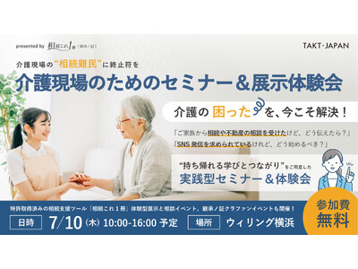 株式会社TAKT-JAPAN(本社:横浜市)は、2025年7月10日(木)、ウィリング横浜901号室にて「介護ロボット・ICT展示会」との同日開催で、特許取得済みの相続支援ツール「相続これ1冊」体験型展示など福祉の複合型イベントを初開催します。