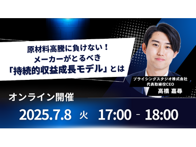 プライシングスタジオ株式会社(本社:東京都港区、代表取締役:高橋嘉尋)は、無料オンラインセミナー『原材料高騰に負けない!メーカーがとるべき「持続的収益成長モデル」とは』を、7/8(火)17時に開催いたします。