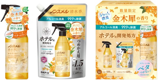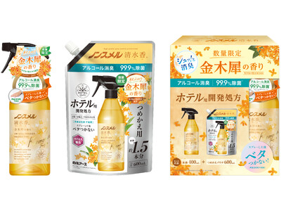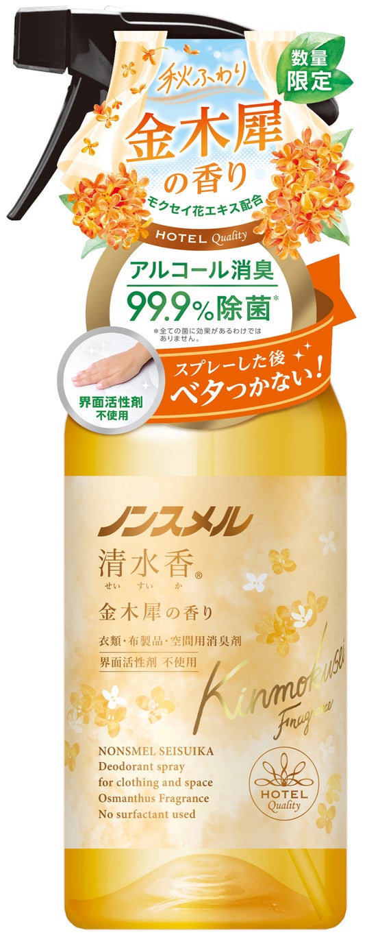 白元アース株式会社(本社:東京都足立区、社長:吉村一人)は、ホテルクオリティの衣類・布製品・空間用消臭剤「ノンスメル清水香(せいすいか)」より、秋限定の『金木犀の香り』シリーズを7月1日より数量限定発売いたします。