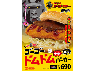 株式会社ゴーゴーカレーグループ(本社:石川県金沢市、代表取締役社長:西畑 誠)は、株式会社ドムドムフードサービスが展開する「ドムドムハンバーガー」との初のコラボレーション商品として、『ゴーゴードムドムバーガー』を2025年7月4日(金)より、全国のドムドムハンバーガー店舗にて期間限定販売することをお知らせいたします。