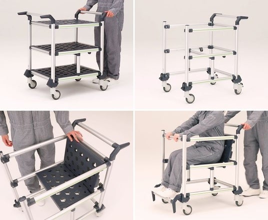 運搬や集荷、受付台、簡易な作業台に使用できる操作性・静粛性に優れた商品で、災害時には、簡易介助チェアに変形できます。お年寄りや体の不自由な人、けが人らの介助チェアとして活用いただけます。