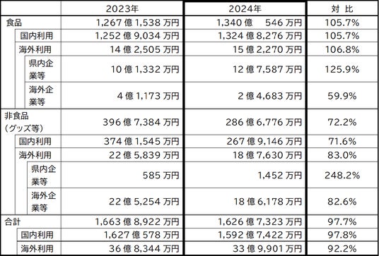 - 昨年(2023年)と比較して、食品での利用が、約72.9億円(5.7%)増加し、非食品(グッズ等)での利用が、約110億円(27.8%)減少しました。