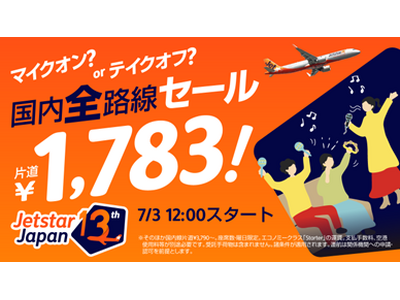 ジェットスター・ジャパン株式会社(本社:千葉県成田市、代表取締役社長:田中正和、以下:ジェットスター) は、就航13周年記念テイクオフmoreキャンペーン第三弾として、2025年7月3日(木)より国内線片道 1,783円*1の「マイクオン?orテイクオフ?国内全路線セール」を開催いたします。