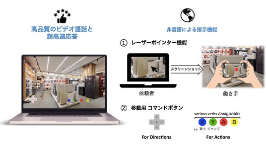 非言語UI機能を活用しリアルタイムで依頼者が、まさに自分がそこを歩く、商品を自分の目で選びながらの買い物(越境宅配も可)、現地の人と会話をすることも可能です。