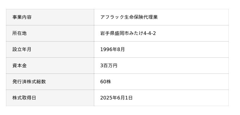 また、この度、長年にわたりアフラック生命保険株式会社の保険商品を取り扱い、岩手県盛岡市を中心とした地域に密着した営業活動を行ってこられた保険代理店の株式を譲受することで、当社の生命保険代理事業における販売網を東北にも拡げ一層強化するものです。本件により、当社の既存の営業基盤と、譲受先の持つ地域密着型の営業ノウハウとの融合が図られ、多様化するお客様のニーズに対し、より質の高い保険サービスの提供が可能になると考えております。