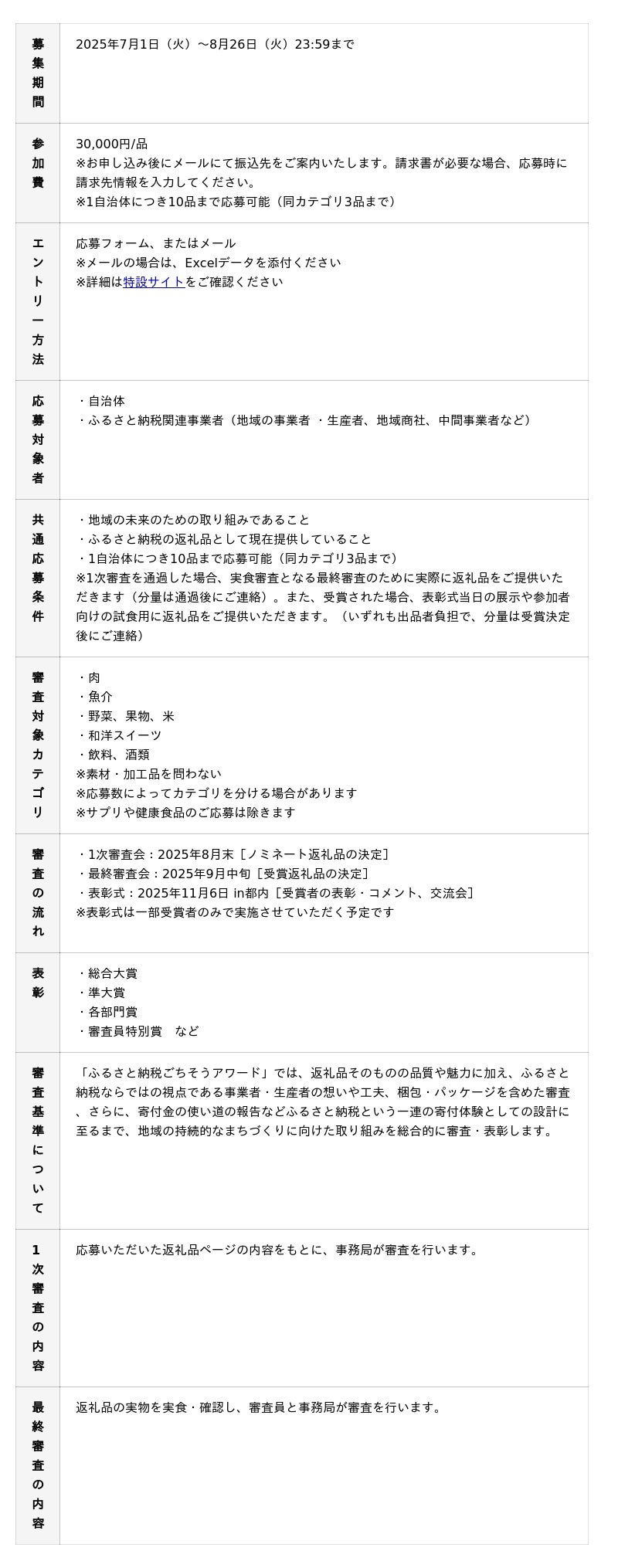 味・見た目・背景のストーリーを重視し、単なる返礼品の競争にとどまらない、「地域の挑戦に光を当てる」取り組みとして、全国の自治体や事業者を巻き込んだ大規模な審査・表彰を実施します。