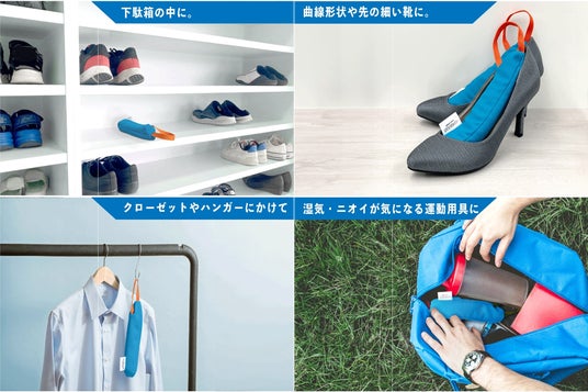 「カラッとヒーロー」は、スニーカー、ビジネスシューズだけでなく、バッグやロッカーなどあらゆるシーンで使え、家庭でも外出先でも、「入れておくだけ」の手軽なケアが可能です。