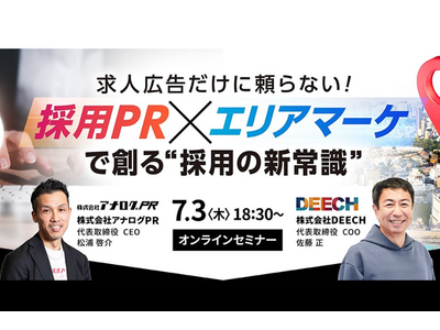 「企業の情報と印象をデザインする」をコンセプトに掲げ、メディアとWEBとオフラインを融合させたマーケティング戦略を提供する、株式会社アナログPR(本社:東京都港区、代表取締役:松浦啓介)は、2025年7月3日(木)に株式会社DEECH(本社:東京都)との共催で、「採用PR × エリアマーケティングで創る『採用の新常識』」と題した無料オンラインセミナーを開催いたします。