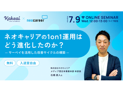 本セミナーでは、ネオキャリア社のメディア西日本事業本部の本部長を務める石橋氏をお招きし、導入から約1年で1on1の満足度が20ポイント以上改善した取り組みや、サーベイを活用した改善サイクルの構築など、1on1の進化プロセスについて、具体的な事例を交えながらお話しいただきます。