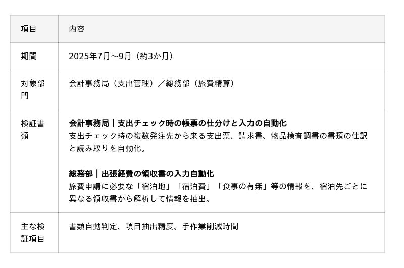 そうした中でなお残っていた課題が、支払票や旅費精算領収書など多様な紙・PDF帳票の手入力と目視チェックでした。従来型AI-OCRでは帳票ごとにOCR設定や追加学習が必要となり、頻繁に形式が変わる自治体業務には適合しづらいため、学習レスで非定型帳票を高精度に読み取れる「RECERQA Scan」が残るペインを解消する候補として浮上し、今回のPoC実施に至りました。
