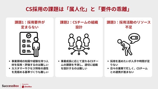 OneBox株式会社(本社:東京都渋谷区、代表取締役社長:伊藤直樹、以下「OneBox」)はこのほど、カスタマーサクセス(CS)領域に特化したBPOサービス「SuccessBox(サクセスボックス)」において、新たにCS職に特化した採用代行(RPO:Recruitment Process Outsourcing)サービスの提供を開始したことをお知らせします。
